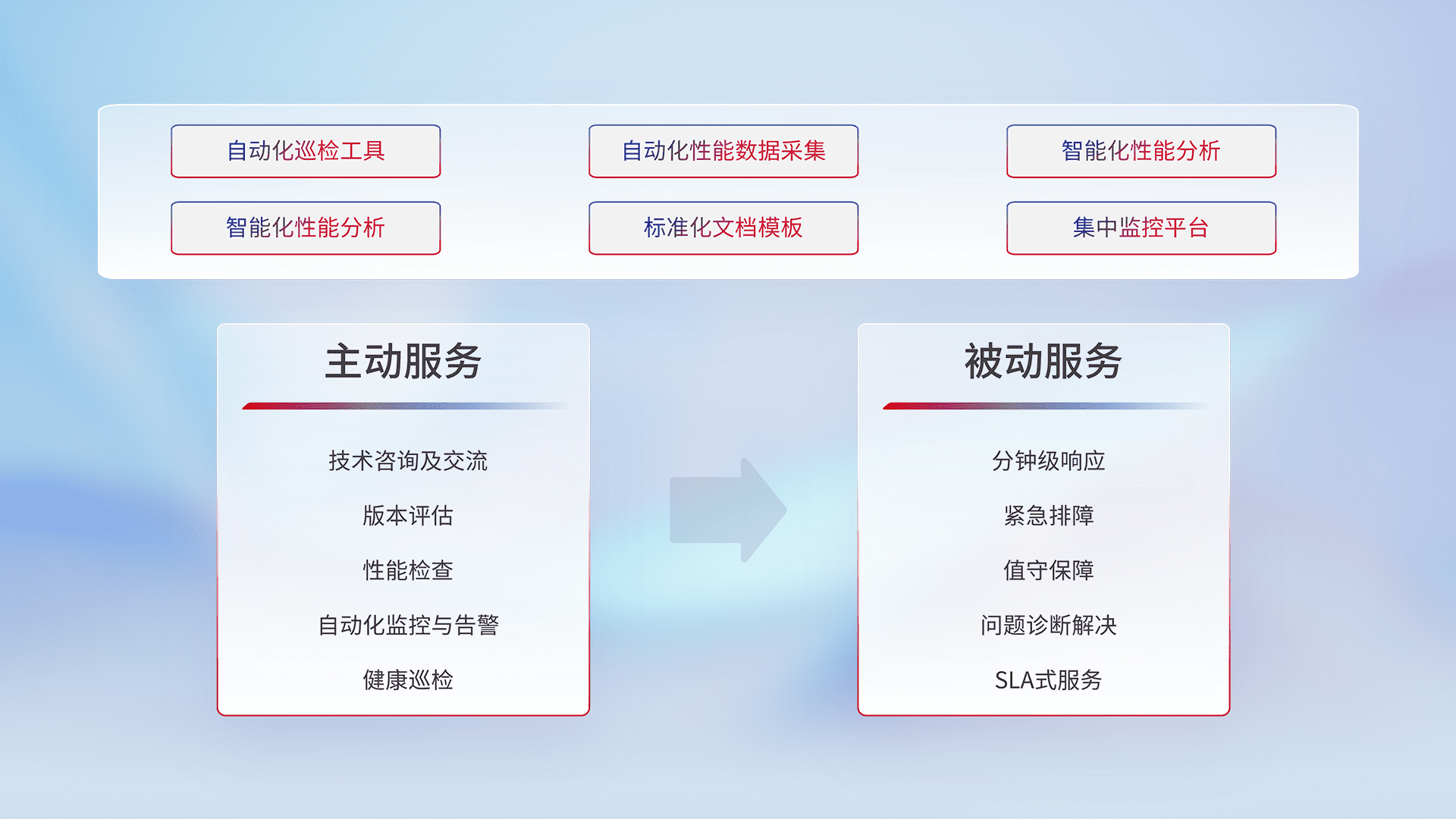 智能化工具和标准化文档,,,,保障服务质量,,提供主动服务(包含技术咨询、、、版本评估、、性能检查、、自动化监控与告警、、、健康巡检)和被动服务包含(分钟级响应、、、紧急排障、、、、值守保障、、问题诊断解决、、、SLA服务)。。。。