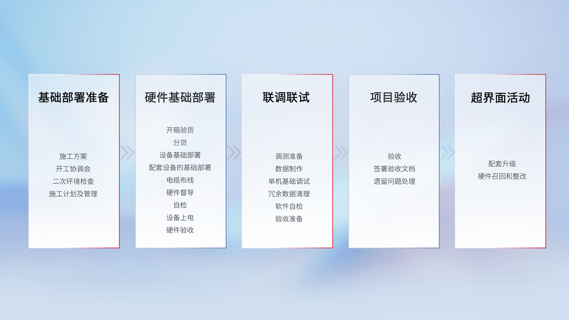 从基础部署准备、、、、硬件基础部署、、联调联试、、项目验收、、、、越界面活动的全过程可追溯,,,保证施工质量和进度。。。。
